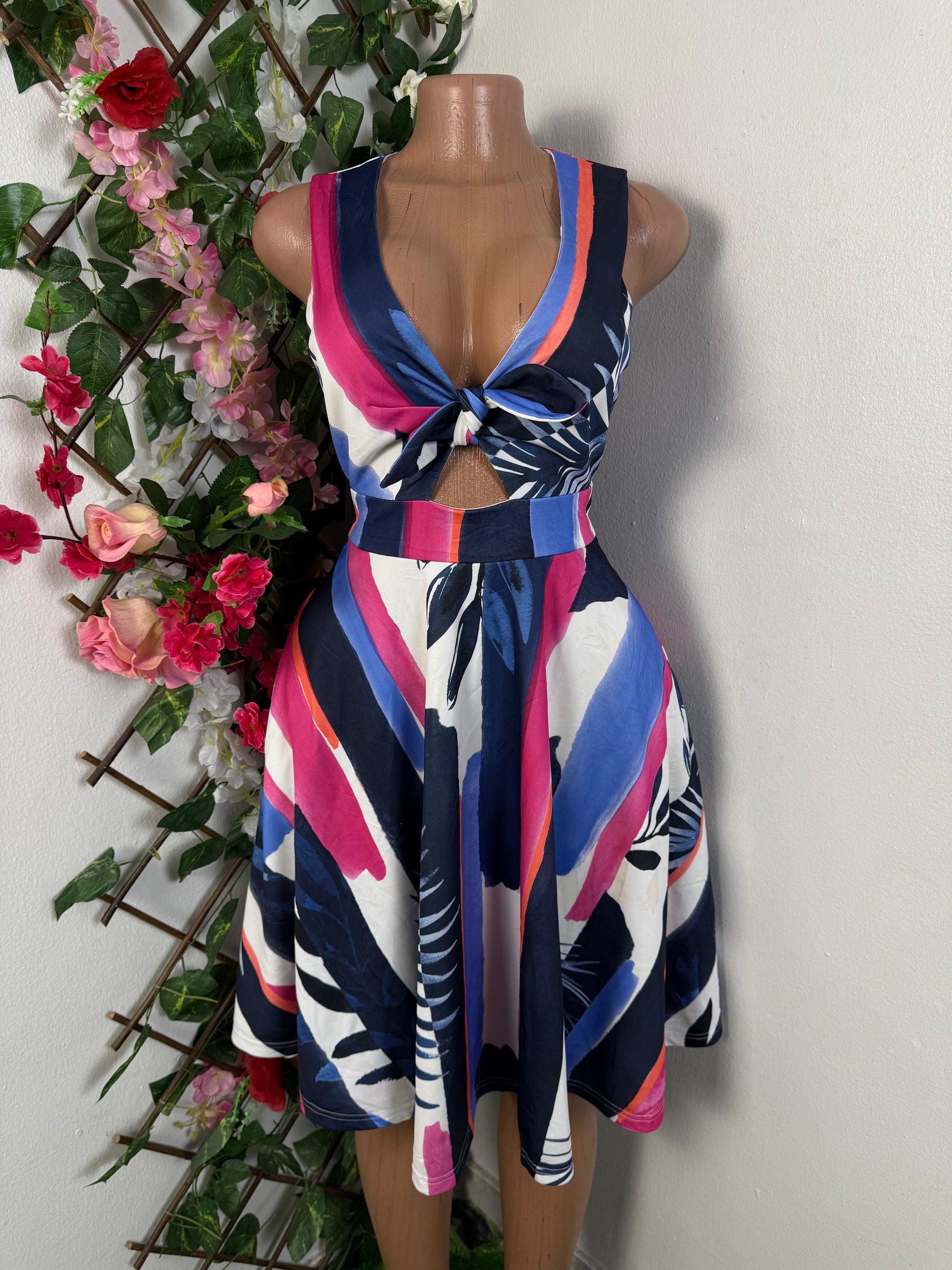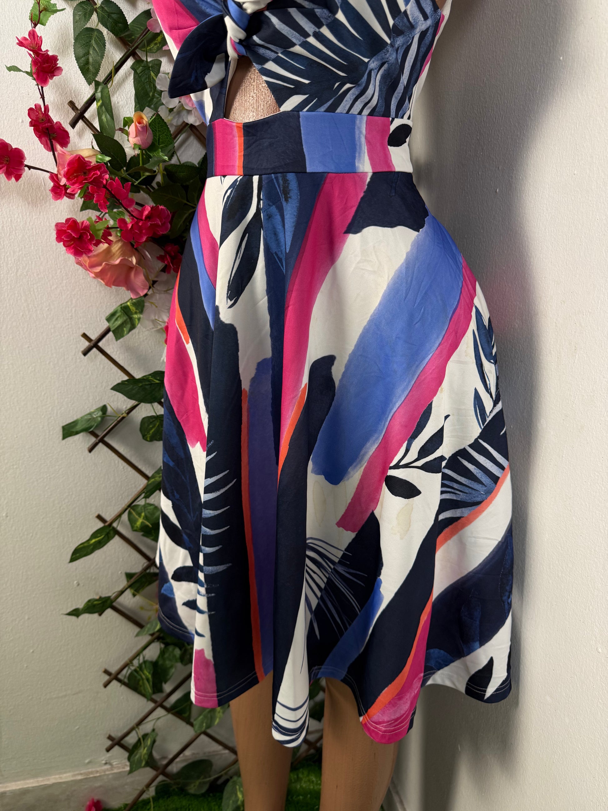 Cette robe évasée sans manche met en valeur votre silhouette grâce à son décolleté délicatement noué. Sa coupe fluide assure un confort optimal tout en apportant une touche d'élégance féminine, parfaite pour vos sorties estivales ou occasions spéciales. Adoptez un style chic et léger avec cette pièce incontournable.