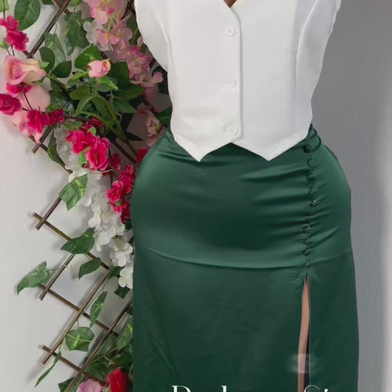 Cette jupe en satin allie élégance et fonctionnalité grâce à sa fente latérale réglable avec bouton. La texture luxueuse du satin offre un drapé impeccable qui sublime la silhouette, tandis que le système de fermeture permet d'ajuster l'ouverture selon l'occasion et le degré de mouvement souhaité.