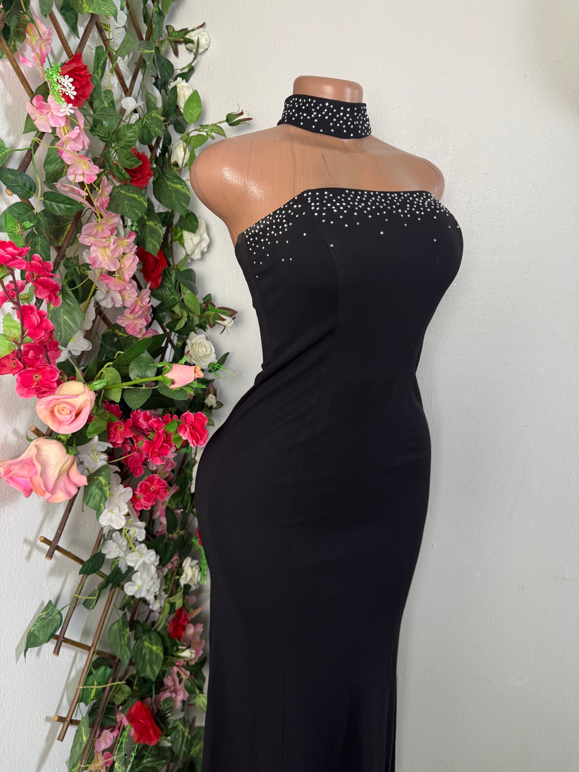 robe soirée longue à queue de poisson, sans manches et avec un cache-cou